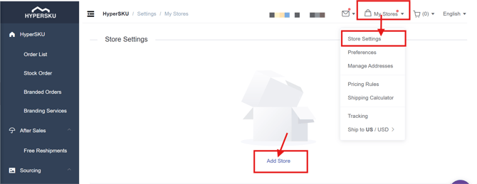 - Log in to your HyperSKU account and go to Settings > My Stores > Add Stores.